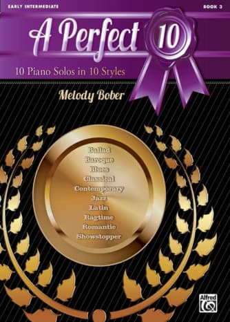 A Perfect 10, Book 3, is a curated anthology of piano solos aimed at fostering musical excellence among early intermediate pianists. Melody has selected a notable teaching piece from each of the four major stylistic periods—Baroque, Classical, Romantic, and Contemporary—and has composed six original works in various genres, including Jazz, Blues, Ragtime, Latin, Ballad, and Showstopper. This collection of ten solos not only presents technical challenges but also offers expressive avenues for students to enhance their skills in mood, rhythm, melody, harmony, form, articulation, and dynamics. While achieving a perfect "10" may not require Olympic-level prowess, students will certainly feel accomplished as they practice and perform these engaging pieces. Notable titles include Arabesque, Blue Sky Rag, Cool Cats, Minuet in D Minor, Sassy Samba, Snake Charmer Blues, Sonatina in C Major, Spring Storm, The Village Maidens, and Winter Memories, with "Cool Cats" and "Winter Memories" recognized as selections for the Federation Festivals from 2016 to 2020.