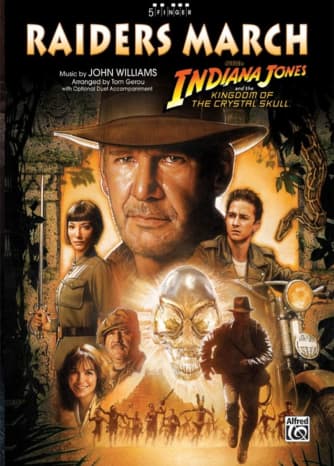 Raiders March is composed in a traditional five-finger format, featuring a melody that is divided between both hands and presented without a key signature. The initial hand position is clearly depicted at the top of the page, while fingerings that extend beyond the indicated position or require a change in hand placement are circled for easy reference. Additionally, an optional duet accompaniment enhances the student's musical experience, providing a more complete and enriched sound.