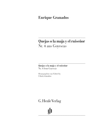 This “Lament, or the maiden and the nightingale” is the fourth movement of Granados’ six-part piano cycle Goyescas (1909–11). The cycle’s title is derived from the name of the Spanish painter Francisco de Goya, whose paintings inspired Granados. The Goyescas conjure up Goya’s Spain of the late 18th century – chivalrous and sensual, but also melancholic and sombre. The overall theme is the life of two young lovers. The “Quejas” are a turning point in the cycle, because here jealousy leads to a lament that is joined by the song of the nightingale. The expressive intensity makes the movement the highpoint of the cycle for many, and G. Henle Verlag is now offering it as an individual Urtext edition.