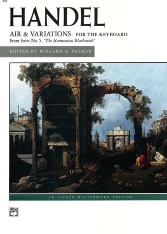 Willard A. Palmer has produced a scholarly edition of Handel's renowned keyboard work, "The Harmonious Blacksmith." This edition features comprehensive performance and historical commentary, reproductions of the original 1720 publication, and editorial enhancements presented in gray print within the score.