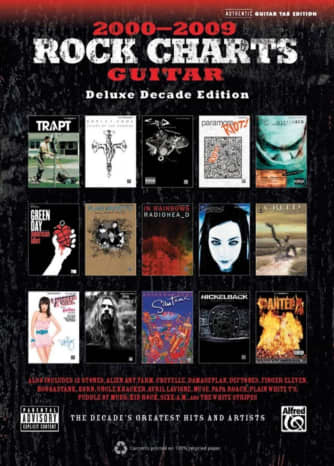 Rock Charts Guitar 2000–2009: Deluxe Decade Edition features a compilation of 43 iconic hard rock guitar tracks that defined the early 2000s. This collection includes notable hits such as "15 Step" by Radiohead, "American Idiot" by Green Day, and "Bring Me to Life" by Evanescence, alongside other significant songs like "Blurry" by Puddle of Mudd and "Freak on a Leash" by Korn. The album showcases a diverse range of artists, from Avril Lavigne's "Complicated" to Nickelback's "Rockstar," capturing the essence of the decade's rock scene with powerful anthems and memorable melodies.